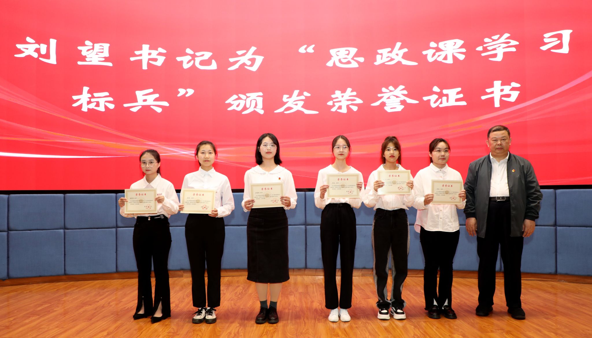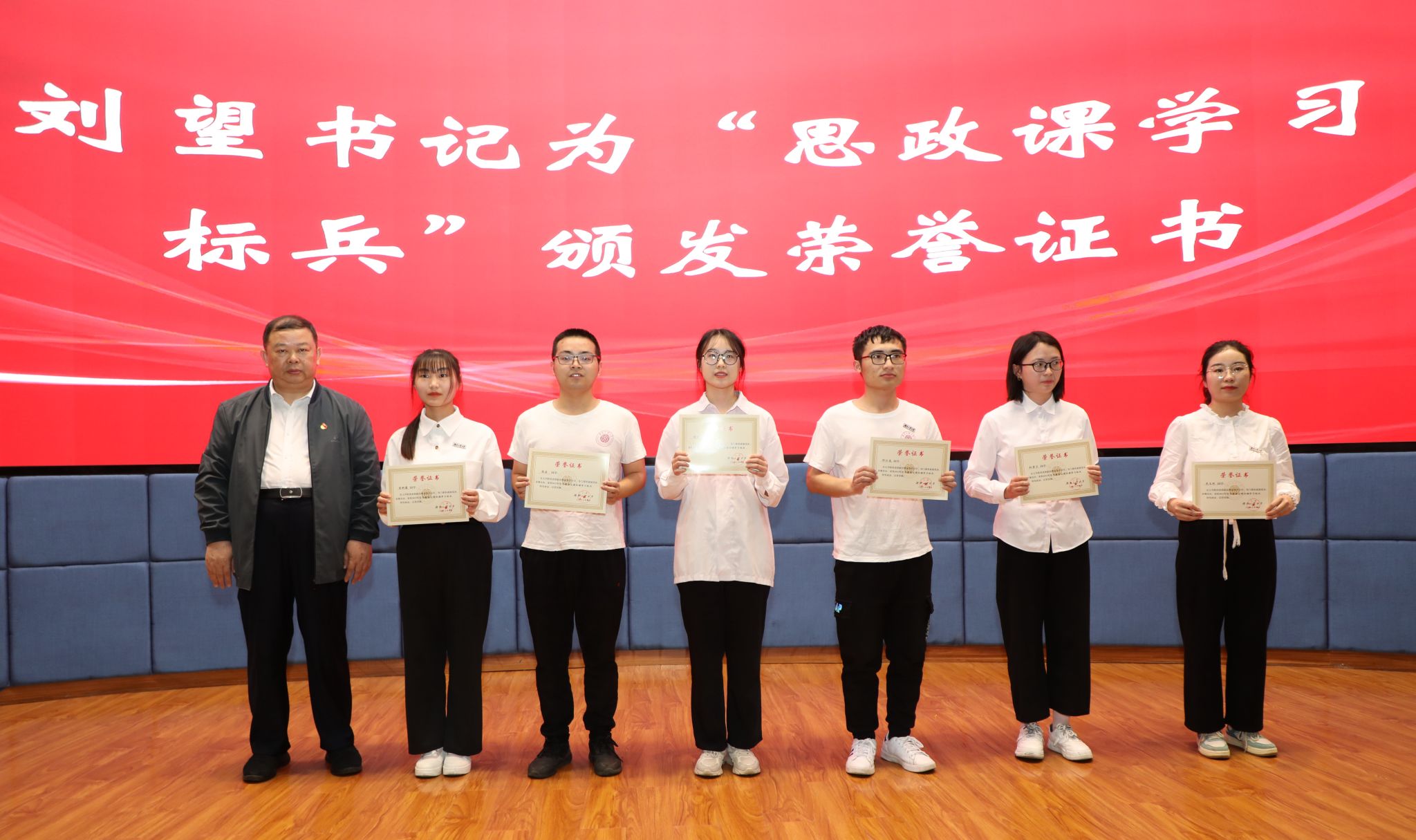 大会播放了“思想政治理论课学习标兵”风采展示视频,刘望为“学习标兵”颁发荣誉证书。