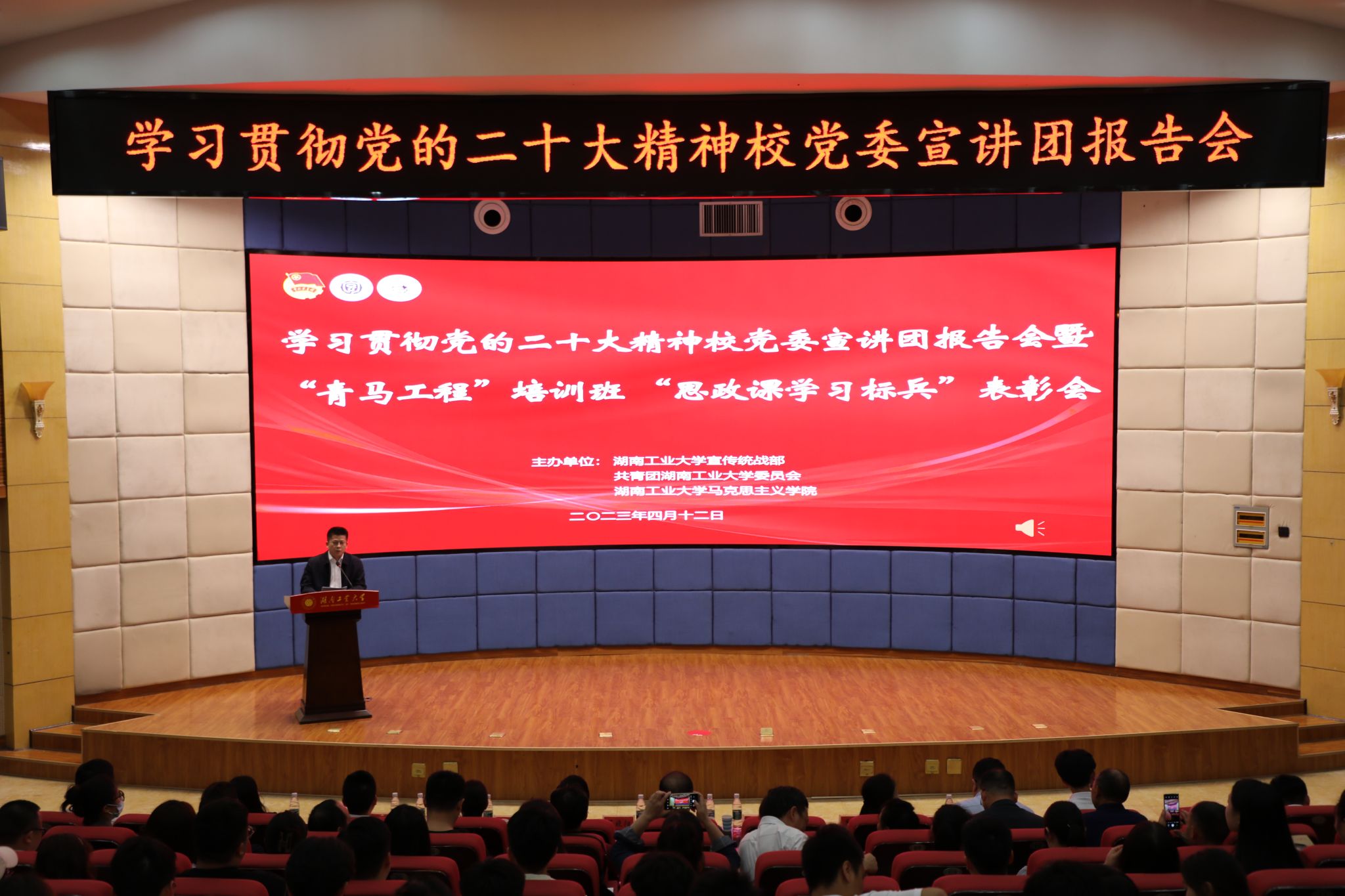 为构建大思政教育格局,营造办好思政课、教好思政课、学好思政课的氛围,表彰先进,树立典型,激励广大青年学生刻苦求知、励志成才,4月12日晚,我校首届“思想政治理论课学习标兵”表彰会在图书馆报告厅举行。党委书记刘望、副校长范晓阳、殷晓元出席,宣传统战部、团委、马克思主义学院、生命科学与化学学院相关负责人、师生代表及校青马学员代表等近400人参加表彰会。