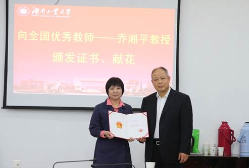 交流会伊始,罗定提向乔湘平教授颁发荣誉证书和奖章,邓世平向乔湘平教授献花。