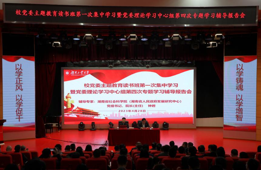 4月28日上午,我校在崇乐楼音乐厅举行校党委主题教育读书班第一次集中学习暨党委理论学习中心组第四次专题学习辅导报告会,湖南省社会科学院党组书记、院长钟君应邀作学习辅导报告,全体校领导、全校副处以上干部、各二级党组织教工党支部书记以及马克思主义学院师生代表参加会议。校纪委书记、省监委驻湖南工业大学监察专员张亚东主持报告会。