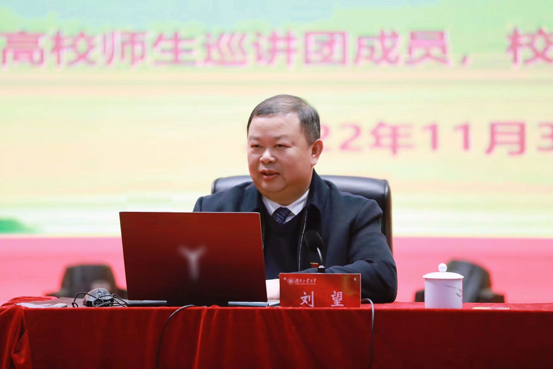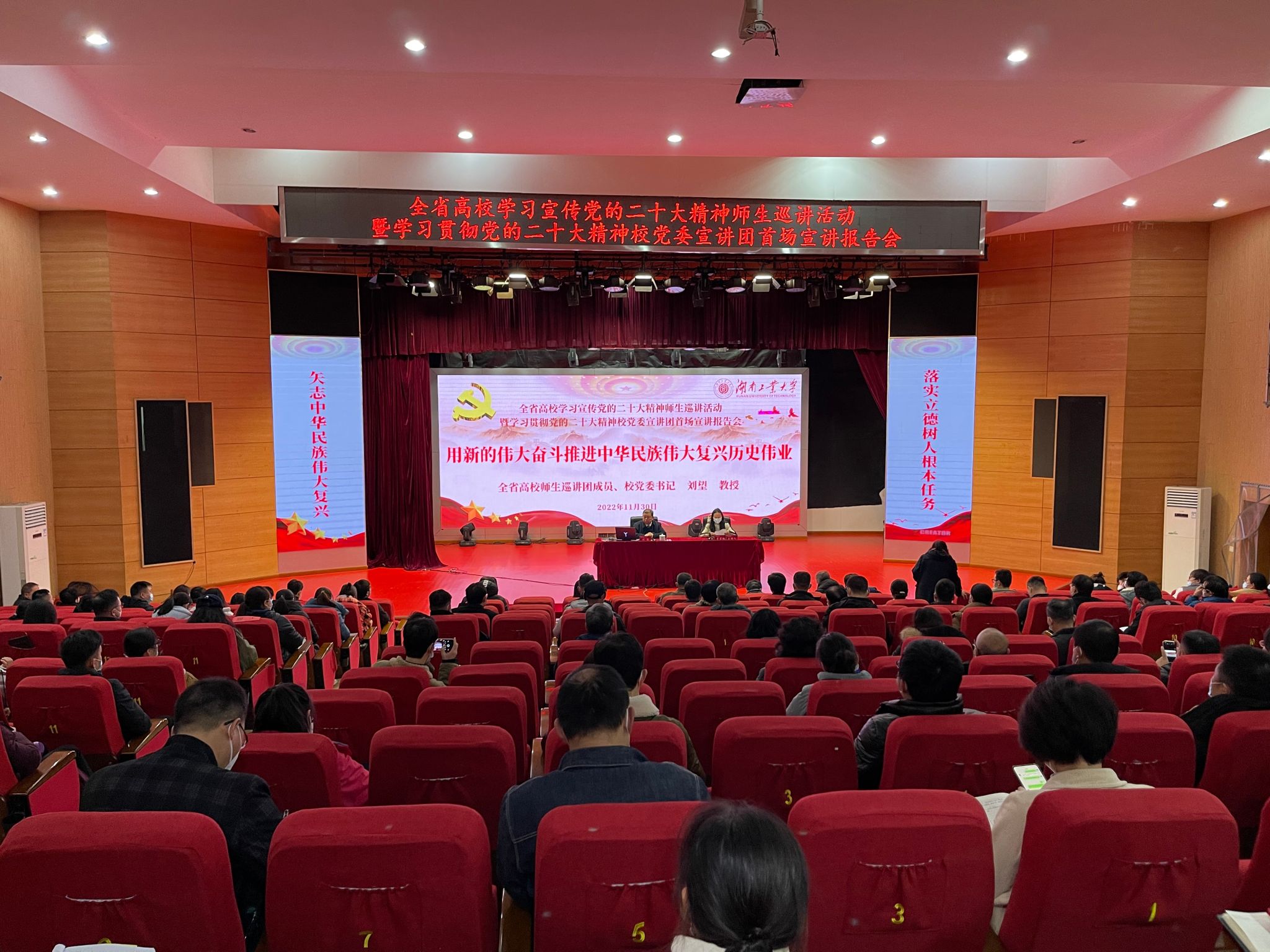 11月30日下午,全省高校学习宣传党的二十大精神师生巡讲活动暨学习贯彻党的二十大精神校党委宣讲团首场宣讲报告会在我校崇乐楼报告厅举行。省高校师生巡讲团成员、校党委书记刘望以“用新的伟大奋斗推进中华民族伟大复兴历史伟业”为题,为我校师生作学习贯彻党的二十大精神宣讲报告。副校长李若梅主持报告会。