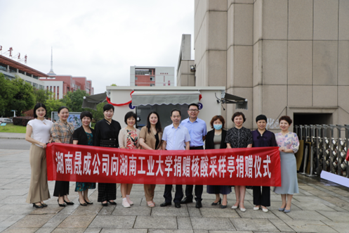 唐少华先生代表公司向学校捐赠价值4.5万元的核酸采样亭;于惠钧代表学校向湖南晟成公司颁发“捐赠证书”。