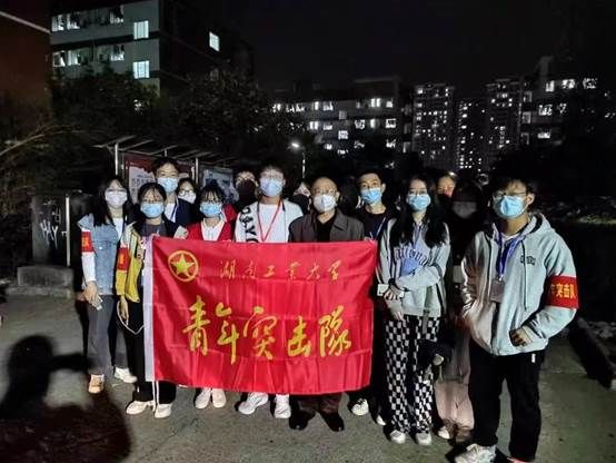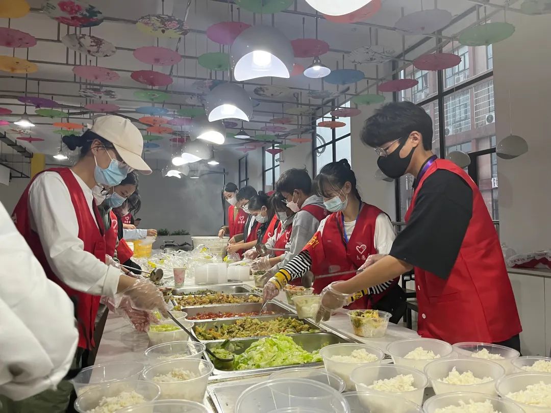 在老师们的身旁,还有一群“红马甲”在默默奉献,他们是由校团委组织的志愿者抗疫青年突击队。这支600余人的志愿者队伍由各学院的学生干部、党员和入党积极分子组成,他们响应学校号召,由校团委老师带领,分成四个分队,积极参与学校后勤保障工作。在食堂里,他们帮助工作人员装餐、打包、搬运餐食,清点餐食数量,20分钟打包1300份饭菜,一气呵成,展现突击队的速度。同时,他们还参与物资统计、搬运、发放,信息收集、检验健康码、扫码登记、维持现场秩序、提醒同学们戴好口罩、协助医务人员做好核酸检测等工作,是辅导员们的好帮手、后勤保障的“有生力量”。“轻伤不下火线,明天我还要继续当志愿者”“看到同学们吃上了热乎乎的饱饭,做上了核酸,一切都是值得的。”从早上7点半工作到晚上11点半,志愿者们第一天连续工作近16个小时,忙碌完后,累到腿脚都在颤抖。然而,忙碌了一天的他们却不愿休息,还在志愿者群里兴奋地讨论明天的工作,选择第二天继续冲锋一线,为抗击疫情贡献青春力量。