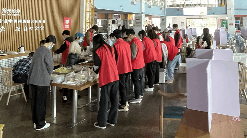 志愿者财管2003班的殷紫轩同学,别看她身材瘦弱,从食堂打饭、抬饭,都健步如飞。她说,目的只有一个:自己快一点,送到同学们手中的饭菜就热一点。道桥1901班的林俊杰说,老师们真的很关心我们,在食堂打菜的时候,老师们总会让食堂工作人员多打点、多打点,一定要让同学吃饱。学生会主席机设2005班的李筱超忙完同学们核酸检测的秩序维护后,又召集志愿者们总结回顾一天的工作,期待大家的志愿工作主动点、再做细一点。