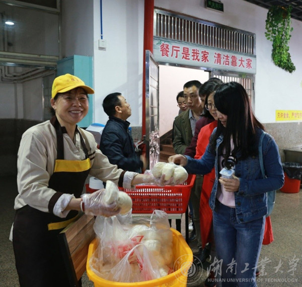 我们新建的教工食堂满一周岁了,工作人员今天格外开心,脸上堆满了笑容,他们为就餐的老师准备了“生日礼物”。老师们送上满满的祝福,“好口福、好幸福,希望我们工大教工食堂越办越好”。