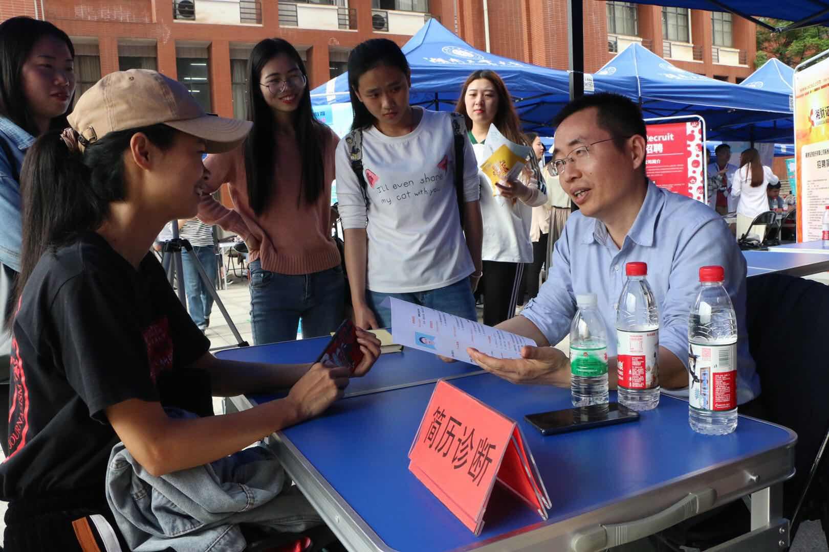 活动中有“经验之谈”更有“实践之行”。在19日下午的招聘会环节,许森林、谢伟分别在现场为学生简历“问诊”,不仅指出简历中存在的问题,还一丝不苟地指导学生修改完善。