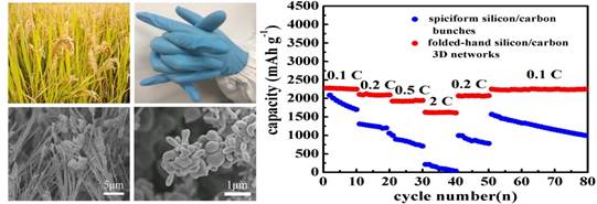 该团队采用超声雾化藕合化学气相沉积法成功合成了双手合抱型和稻穗状结构的无粘结剂硅基负极材料。可控设计出的过渡碳层在电化学反应过程中有效地动态移动,消除了硅基材料与集流体之间因体积效应而产生的应力,解决了电极材料的粉碎和脱落现象取得了极其优越的电化学性能。在100次循环后仍然具有2167 mAh g-1的容量和95%的容量保持率,并且保持了电极结构的完整性。与磷酸铁锂(LiFePO4)正极制备的全电池在500次循环后容量仍有149 mAh g-1,容量保持率92%。该研究成果以“Folded-hand silicon/carbon three-dimensional networks as a binder-free advanced anode for high-performance lithium-ion batteries”为题发表在Chemical Engineering Journal 353 (2018) :666-678(IF=8.355,一区)上。(文章链接为https://doi.org/10.1016/j.cej.2018.07.165)
