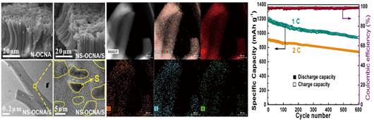 该团队采用豆渣为原料通过两段式水热反应,并用甲醛为结构引导剂,成功合成了氮/硫共掺杂有序碳纳米阵列结构的锂硫电池正极材料。该复合材料提高了硫的负荷量,改善了化学吸附能力,使其可以在电化学反应过程中有效地抑制多硫化物的溶解,提高离子传输速率,进而取得了极其优越的电化学性能。在2 C倍率下,首次放电容量为914 mAh g-1,600次循环后仍然具有739 mAh g-1的容量和81%的容量保持率。该研究成果以“Nitrogen/sulfur co-doped ordered carbon nanoarrays for superior sulfur hosts in lithium-sulfur batteries”发表在Journal of colloid and interface science 554 (2019) : 711-721. (IF=6.361,一区)上。(文章链接为https://doi.org/10.1016/j.jcis.2019.07.057。)