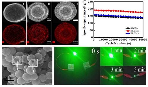 该团队利用聚合速度的差异,采用异质异步成核方法,可控制备出多壳层中空碳微球,实现了碳层厚度和层数的有效调节。制得的双层碳微球比表面积高达1537.32 m2g-1,在2M KOH电解液中,比电容可达211.25 F g-1。通过氮掺杂后进一步活化碳微于产生更多的活化点位,比表面积提高到2869.7 m2 g-1,比容量达到318.5 F g-1。组装的对称超级电容器呈现高的能量功率密度6.4Wh kg-1和447 W kg-1)和良好的循环稳定性。该研究成果以“Scalable and controllable synthesis of multi-shell hollow carbon microspheres for high-performance supercapacitors”为题发表在Carbon 154 (2019) :330-341(IF=7.466,一区)上。(文章链接为https://doi.org/10.1016/j.carbon.2019.08.022。)