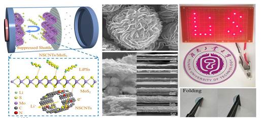 该团队采用水热法合成了花状二硫化钼包覆氮硫共掺杂碳纳米管复合材料。将其应用于锂硫电池正极,交联的碳纳米管骨架具有良好的弹性和机械强度并提供了快速的电子传输渠道,硫氮共掺杂在其表面形成了丰富的活性位点,均匀生长的二硫化钼促进了反应过程中对多硫化锂的化学吸附。该结构设计能有效抑制多硫化物的“穿梭效应”,大幅度提升电池的循环稳定性和倍率性能,1C下放电容量达814 mAh g-1并在1000次循环中仅每循环损失0.02%。该研究成果以“Rational Fabrication of Nitrogen, Sulfur Co-Doped Carbon Nanotubes/MoS2for High-Performance Lithium-Sulfur Batteries”为题发表在ChemSusChem12(2019):3602-3614 (IF=7.804,一区)。(文章链接为:http://dx.doi.org/10.1002/cssc.201900929。)