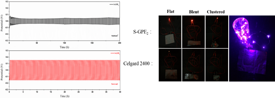 该团队利用商业海绵高吸湿性以及高柔韧性作为力学骨架,采用原位聚合的方法制备了高强度、高韧度、可压缩的3D凝胶电解质。商业海绵的三维互通多孔网络可以有效地耗散应力为凝胶电解质的力学性能提供了保障,而三维交联的聚醚骨架与电解质具有强亲和力为凝胶电解质提供了离子通道。该电解质可以有效的稳定SEI膜从而达到抑制锂枝晶,同时柔韧的凝胶充当隔膜赋予了锂离子电池优异的可弯曲性甚至搓揉成团。该研究成果以“Dendrite-free lithium deposition induced by mechanical strong sponge-supported unique 3D cross-linking polymer electrolyte for lithium metal batteries”为题发表在Journal of Power Sources 435 (2019): 226748 (IF:7.467,一区)上。(文章链接为https://doi.org/10.1016/j.jpowsour.2019.226748。)