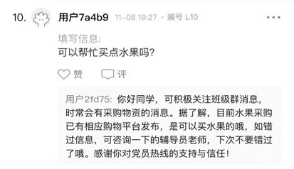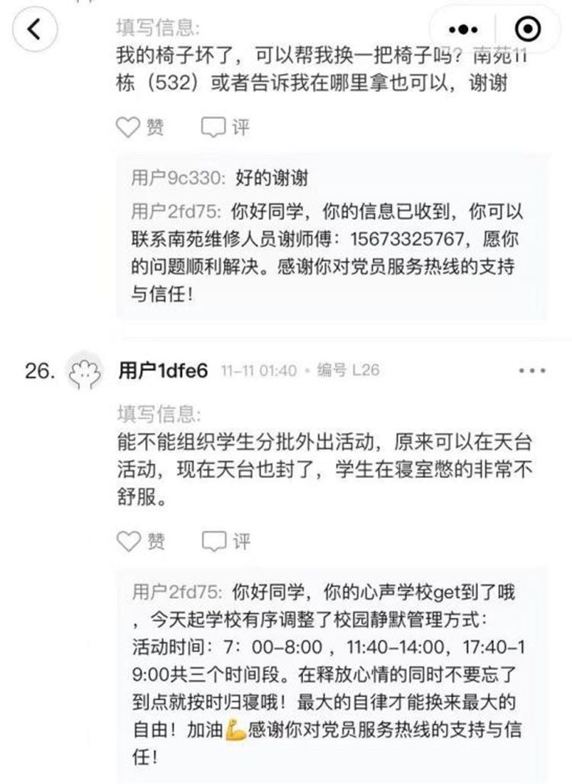 目前,该平台已收到同学们几十条留言信息,内容主要包括物资需求、对食堂饭菜的建议、维修报修问题、学校静默管理政策的咨询等等。对于同学所有的心声与诉求,党员同志们都积极回应,接诉即办,确保“件件有着落、事事有回音”。