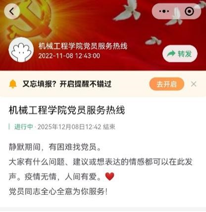 为深入贯彻落实党的二十大精神,充分发挥党组织战斗堡垒作用和党员先锋模范作用,在疫情突然来袭,全校师生同心抗疫之时,机械工程学院学生党支部开辟了“有困难,找党员”党员服务热线平台。同学们在校园静默管理期间有任何问题、意见、建议或想表达的情感都可在此平台发声,党员同志第一时间回复,保证信息渠道的畅通。