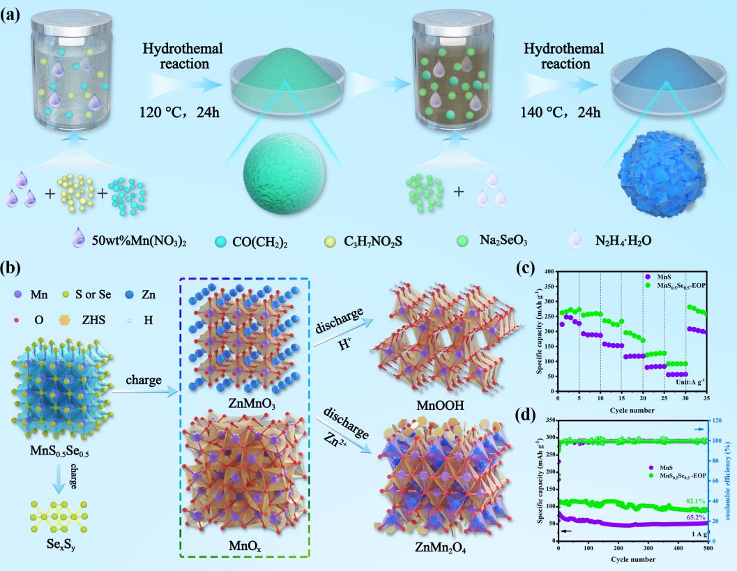 (a)MnS0.5Se0.5微球的合成示意图,(b)MnS0.5Se0.5电极的储能机理示意图,(c, d)MnS0.5Se0.5-EOP//Zn AZIBs电化学性能图