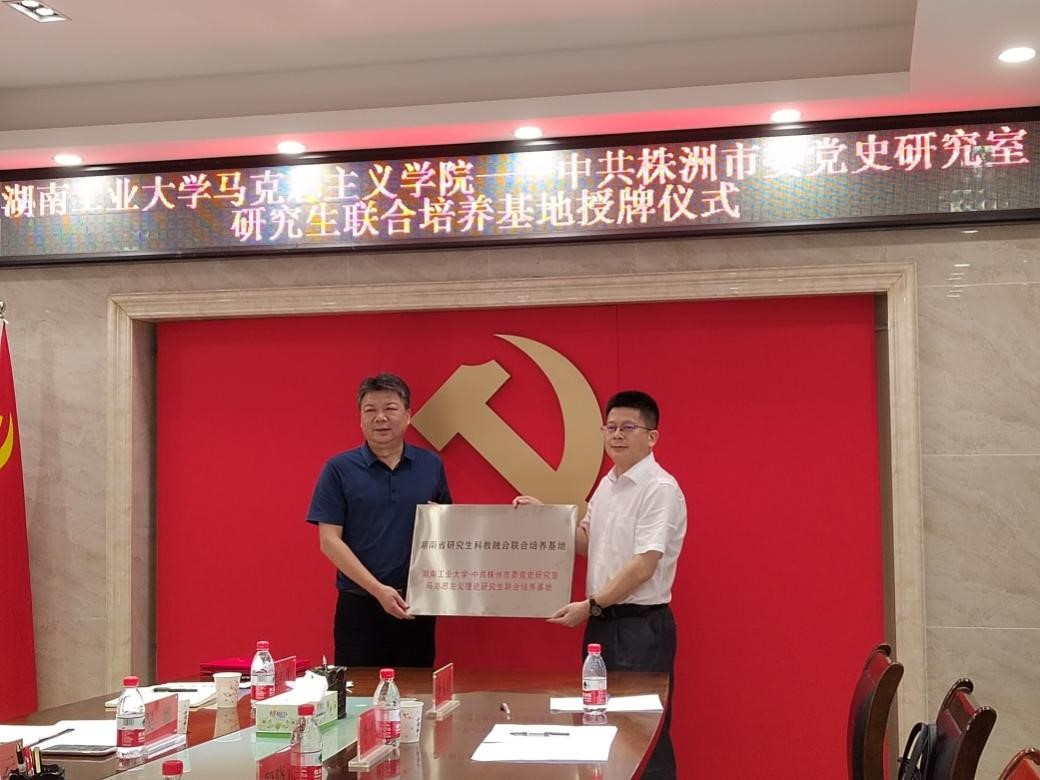6月29日下午,“湖南工业大学马克思主义学院-中共株洲市委党史研究室”研究生联合培养基地授牌仪式在中共市委党史研究室(市地方志编纂室)会议室举行,双方就共建研究生培养基地进行座谈交流。