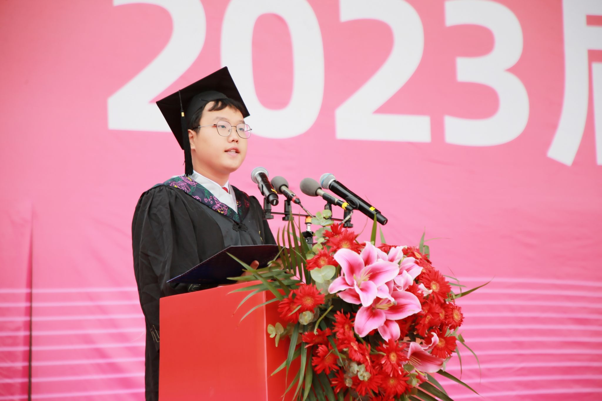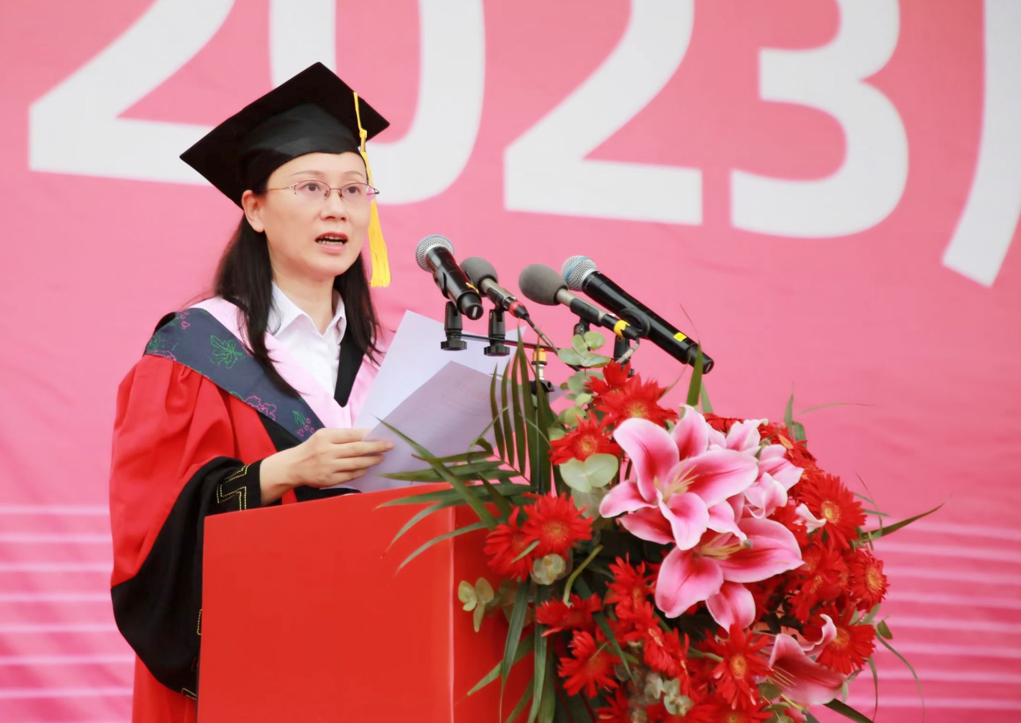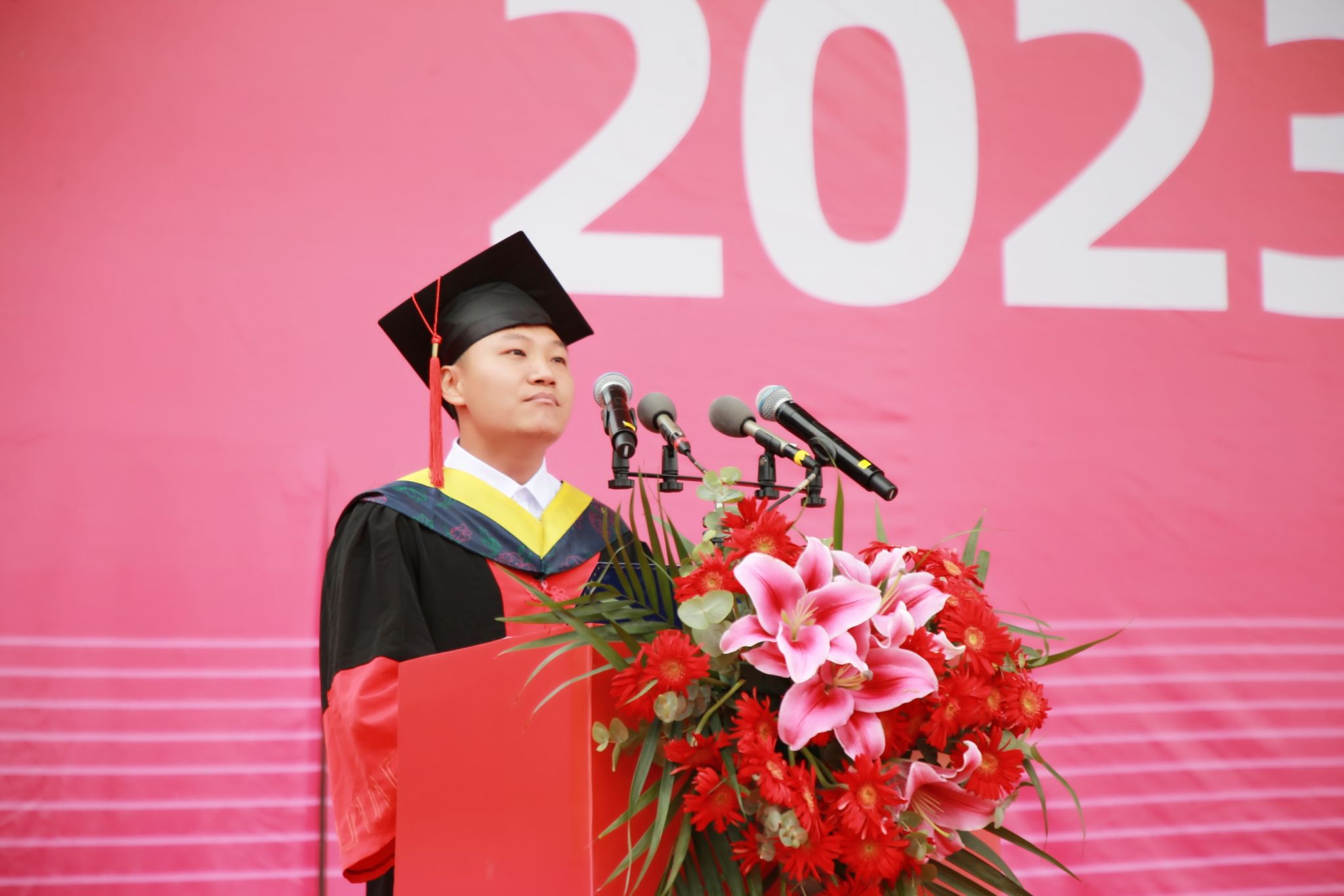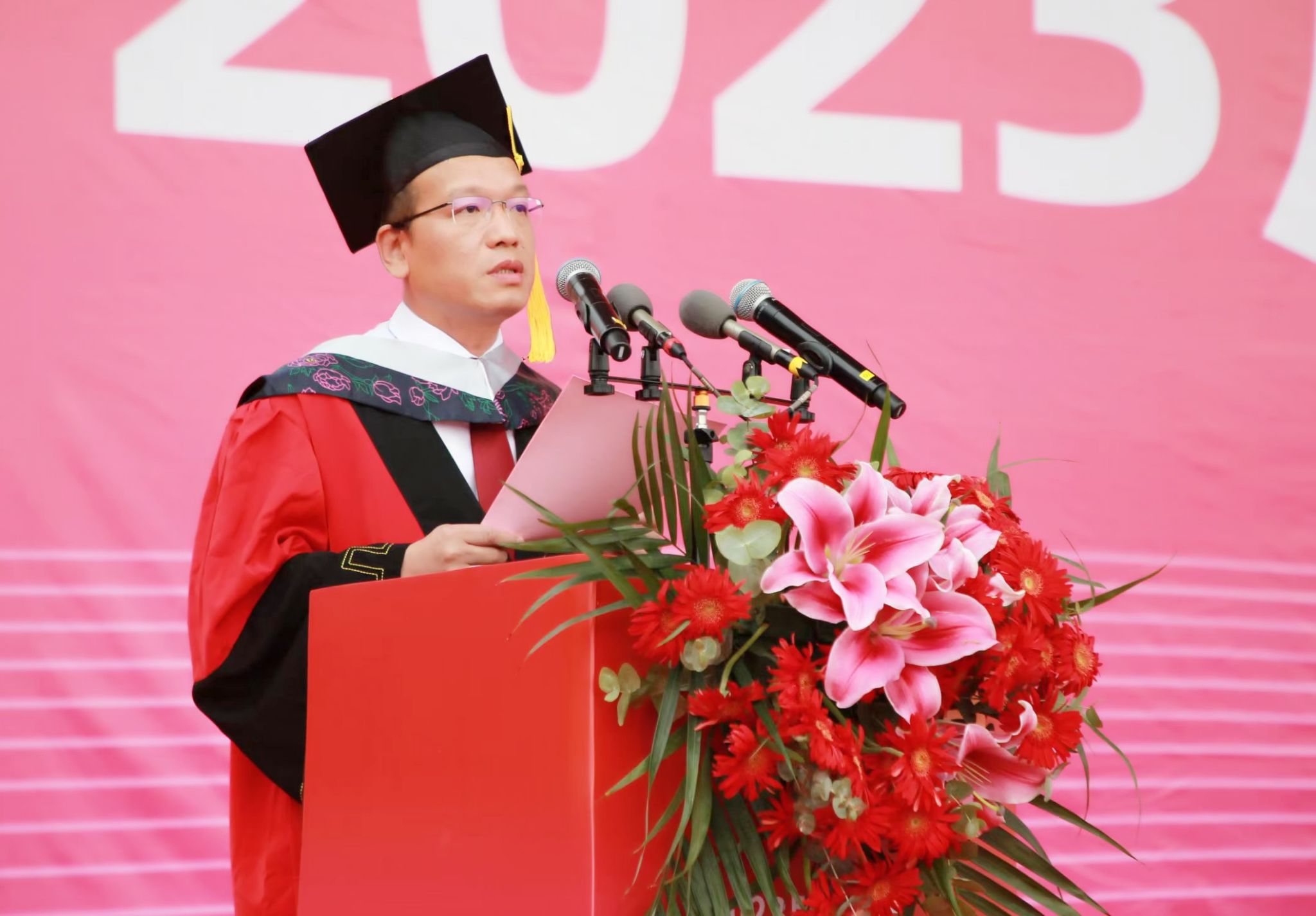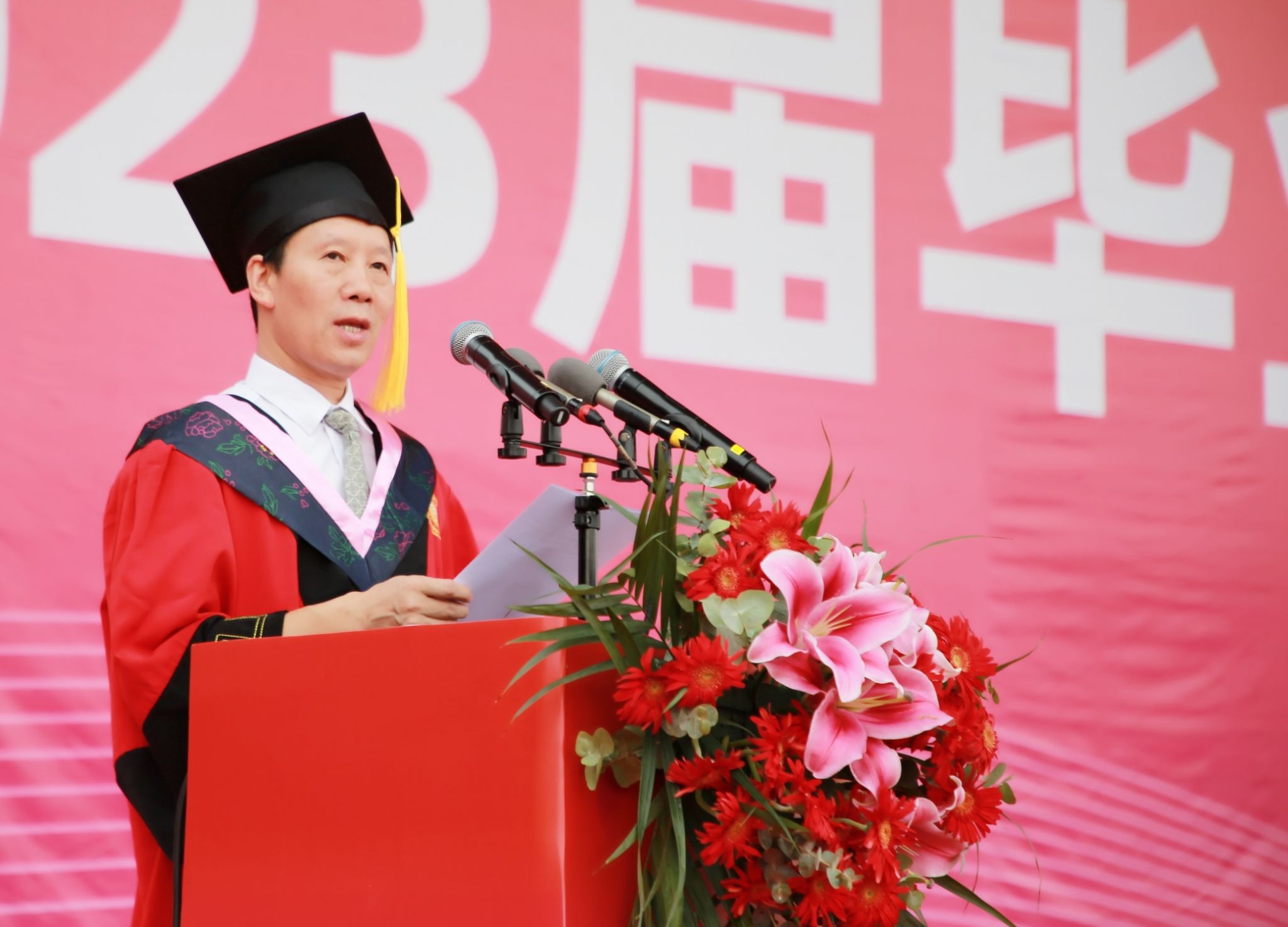 典礼上,副校长佘朝文受校长蒋昌波委托,代表学校向圆满完成学业,开启新的人生旅途的毕业生表示热烈祝贺,向指导、培育他们的父母和老师表示衷心感谢。他表示学校经历跨越式的蓬勃发展,全体师生参与了三年的同心抗疫,毕业生们也经历蜕变式的破茧成蝶。他寄语广大毕业生:要秉持理性,坚守初心,将所学所思变成解决现实问题的方法和路径,用理性的光辉驱散谬误的迷茫,用科学的思维去发现未来,用智慧的力量去引领新的时代。要加强学习、丰盈自身,不断学习各种新思想新理念新技术,努力充实自身的知识库,提升自身技能值。要踔厉奋发、勇毅前行,保持敢为人先的豪气、革故鼎新的锐气、创新发展的勇气,把个人奋斗成才与国家发展、民族进步融为一体,为全面建设社会主义现代化强国、实现中华民族伟大复兴中国梦贡献自己的青春力量。