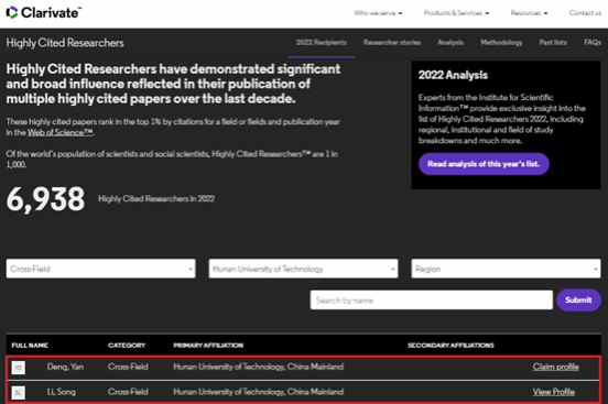 “高被引科学家”名单遴选全球高校、研究机构和商业组织中对所在研究领域具有重大和广泛影响的顶尖科学人才,入选这份榜单的学者在过去十年间均发表了多篇高被引论文,其被引频次在 Web of Science 中位于同学科前1%,彰显了他们在同行之中的重要学术影响力。本次共有来自69个国家和地区的6938名科学家入选“高被引科学家”,中国共有1169人次入选。