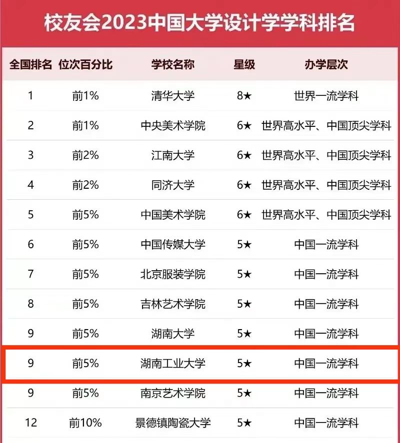 9月12日,全国第三方大学评价研究机构艾瑞深校友会网(Cuaa.net)最新发布校友会2023中国大学一流学科排名、2023中国大学设计学学科排名。榜单显示,我校名列校友会2023中国大学设计学学科排名10强。
