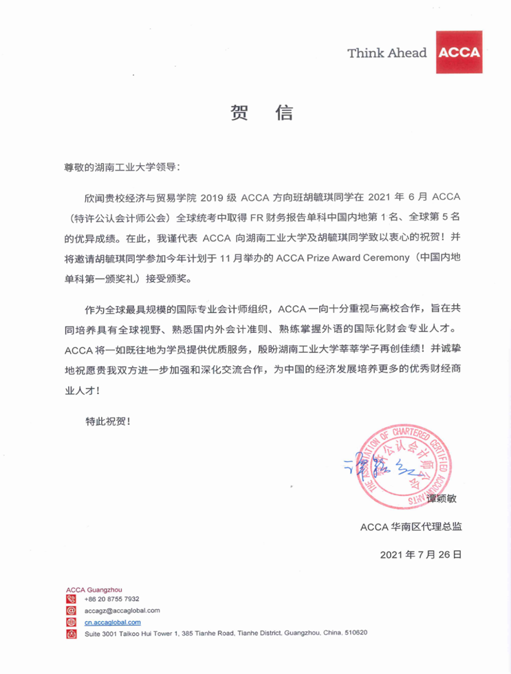 近日,从ACCA官方获悉,在2021年6月举行的ACCA(英国特许公认会计师公会,俗称“国际注册会计师”)全球统考中,我校经济与贸易学院2019级ACCA创新实验1901班胡毓琪同学在FR(Financial Reporting财务报告)课程考试中以91分高分荣获单科中国内地第1名,全球第5名的优异成绩。