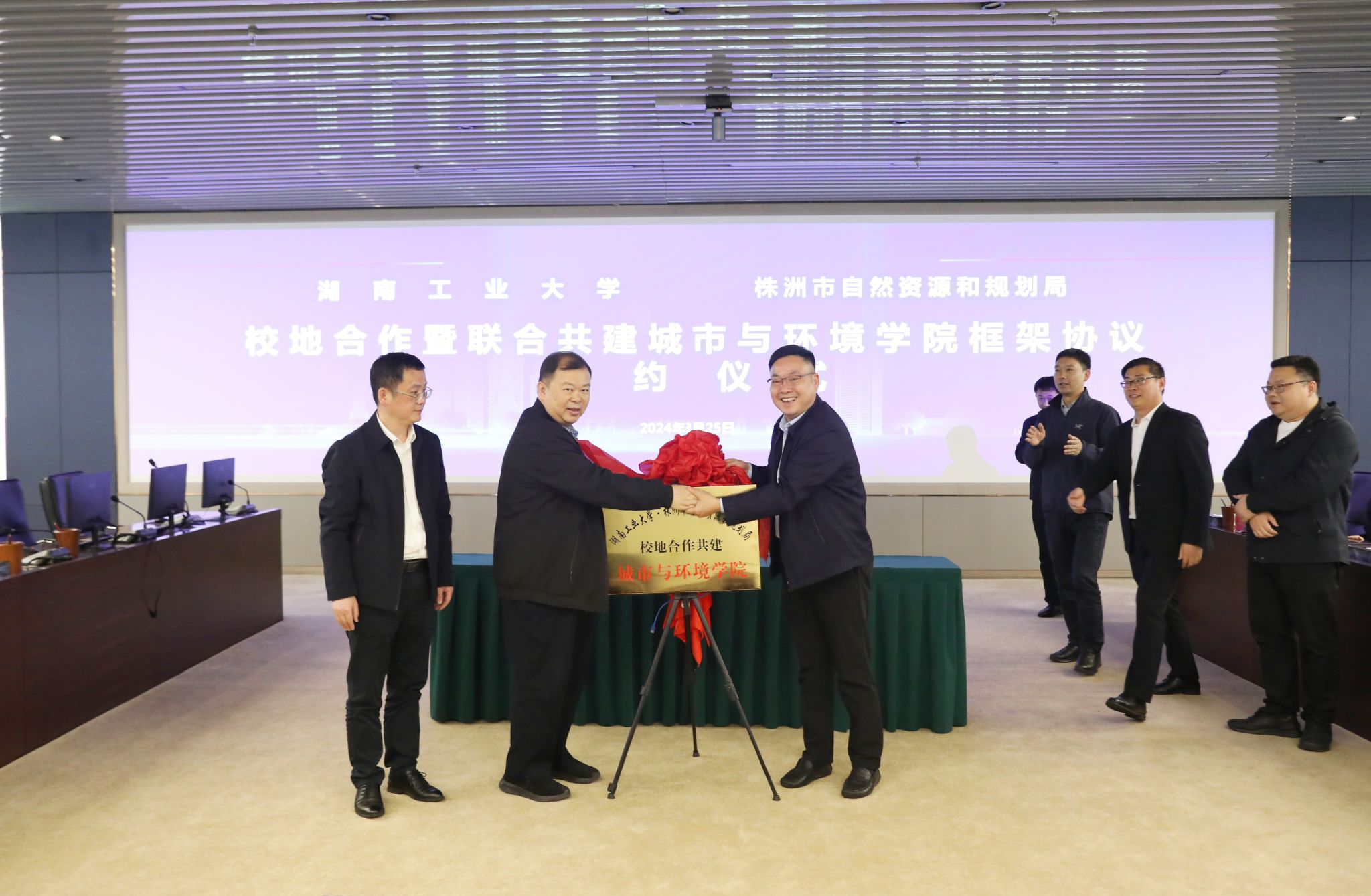 在双方领导、专家的共同见证下,何杰和张金望分别代表湖南工业大学和株洲市自然资源和规划局签署了签署校地合作共建框架协议,刘望和徐业伟共同为校地联合共建城市与环境学院揭牌。
