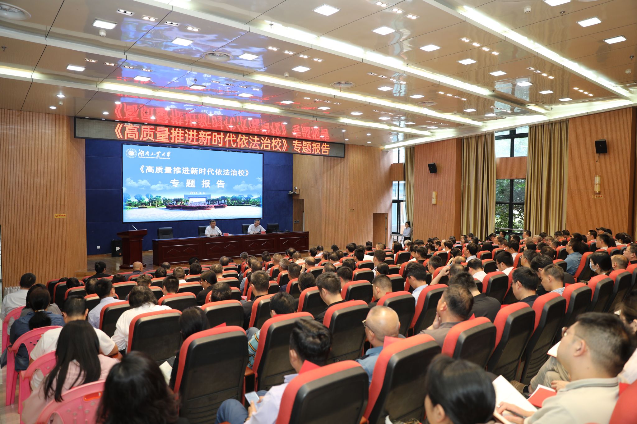6月6日下午,我校举行高质量推进新时代依法治校专题报告会。本次会议主会场设在崇德楼报告厅,崇学楼音乐厅为分会场,全体在家校领导出席,所有副科级以上干部参加会议。党委书记刘望主持会议,校长蒋昌波作主题报告。
