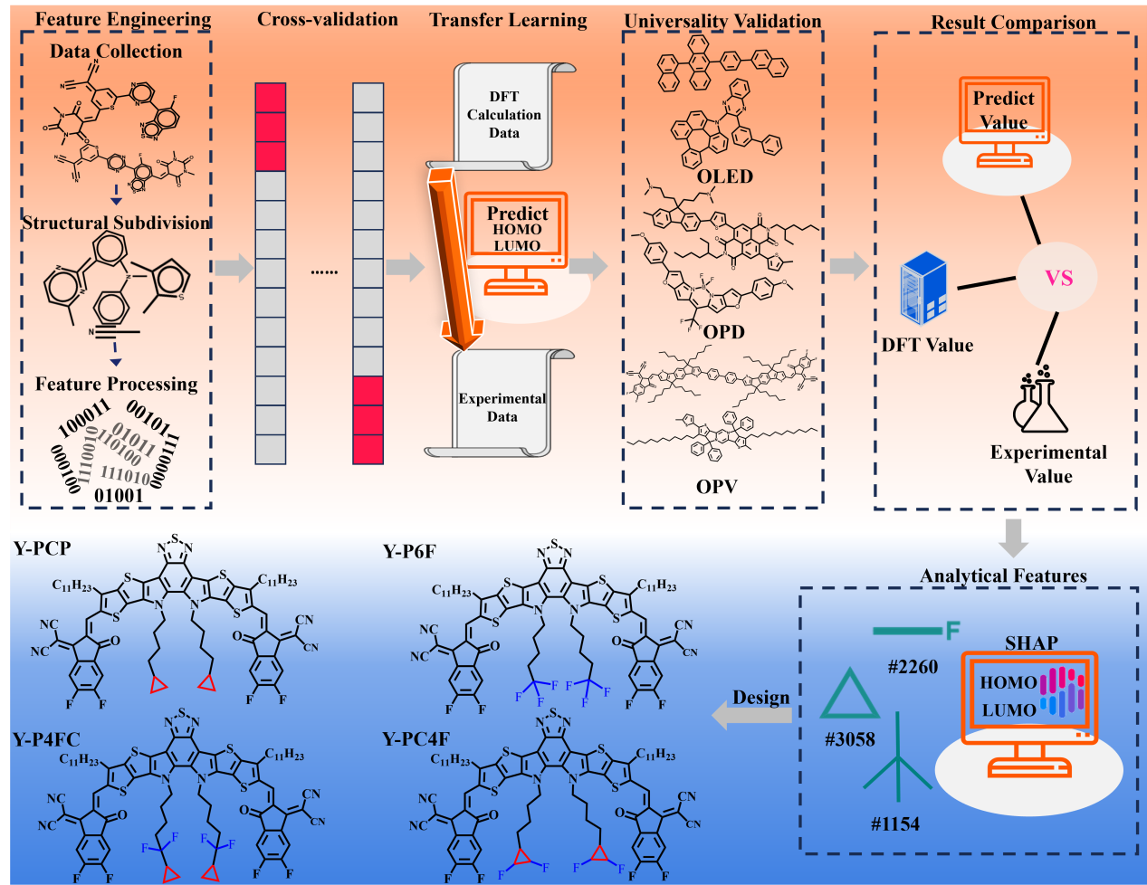 近日,我校轨道交通学院电子材料与器件团队在有机光伏器件研究方面取得新进展。该团队利用机器学习和迁移学习以90%的准确率预测有机材料前沿分子轨道能级,挖掘有机材料的关键结构特征并定量分析有机材料分子结构对于前沿分子轨道能级的影响因素,为加速获取有机材料电子特性提供了一种低成本高效益的方法,同时也为制备新型有机材料的逆向设计提供了指导框架。