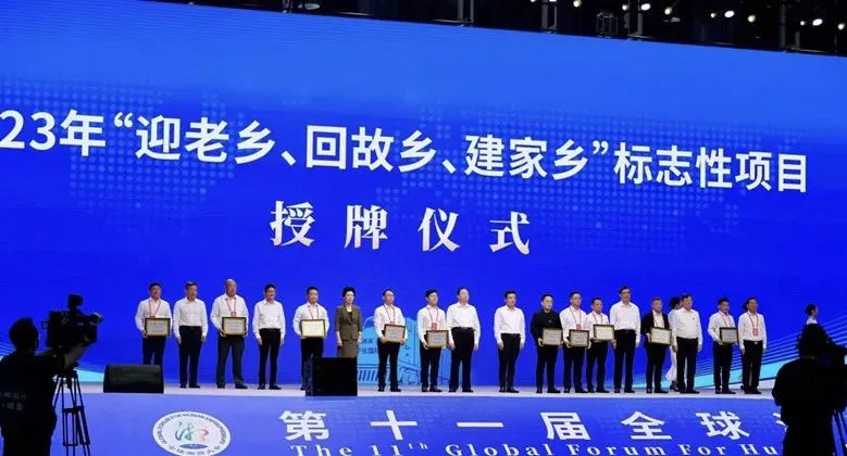 本届全球湘商大会以“新引领 新高地 新篇章”为主题,来自世界各地的湘商代表、院士专家、知名民营企业家代表汇聚一堂。开幕式现场发布了2022—2023年“迎老乡、回故乡、建家乡”标志性项目光荣榜,亚辉龙董事长胡鹍辉、国辰投资董事长胡治国上台接受奖牌。