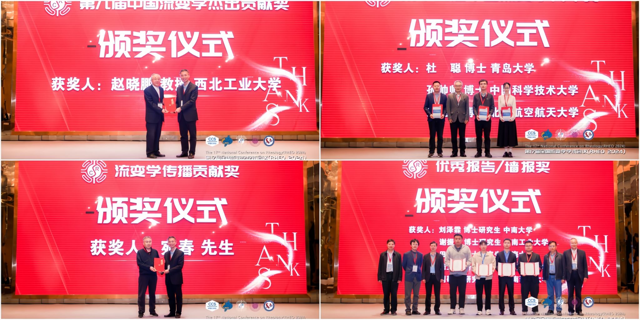 在闭幕式上,大会向西北工业大学赵晓鹏教授颁发了“第九届中国流变学杰出贡献奖”,向青岛大学杜聪博士、中国科学技术大学孙帅帅博士、北京航空航天大学谢驰宇博士颁发“第十三届中国流变学青年奖”,向宛春先生颁发“流变学传播贡献奖”。此外,大会还评选出五项优秀报告和墙报奖,获奖者包括中南大学刘泽霖、湖南工业大学谢振炎、河海大学田茗源、上海交通大学陆亚东和华南理工大学刘敬仁。