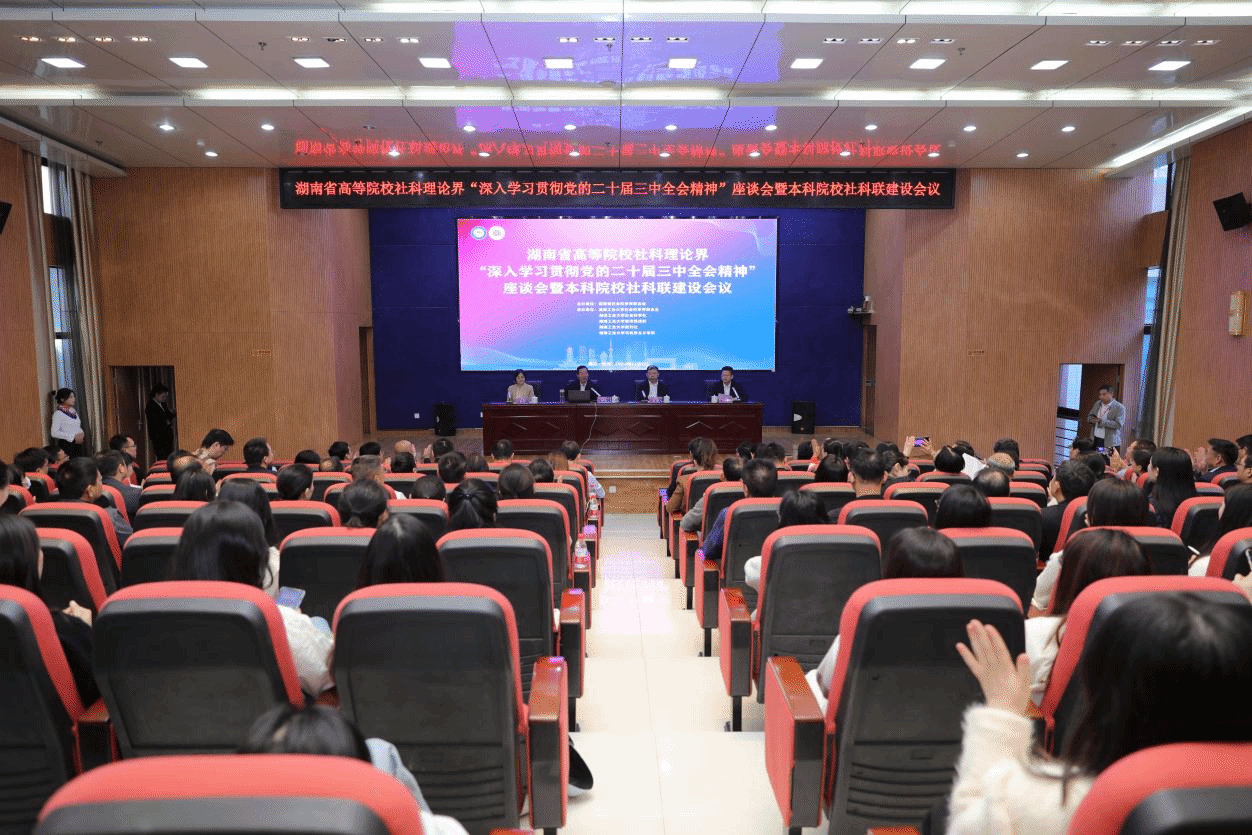 11月8日,由湖南省社科联主办、我校社科联、社科处、宣传统战部、期刊社、马克思主义学院承办的湖南省高等院校社科理论界“深入学习贯彻党的二十届三中全会精神”座谈会暨本科院校社科联建设会议在我校崇德楼报告厅举行,省社科联党组书记、副主席(主持日常工作)胡代松,党组成员、副主席雷炘,我校党委书记刘望,副校长殷晓元,株洲市社科联党组书记罗峰出席,省社科联科研组织处、中南大学等全省30多所高校社科处负责人,我校社科联委员、师生代表共200余人参加会议。殷晓元主持会议。