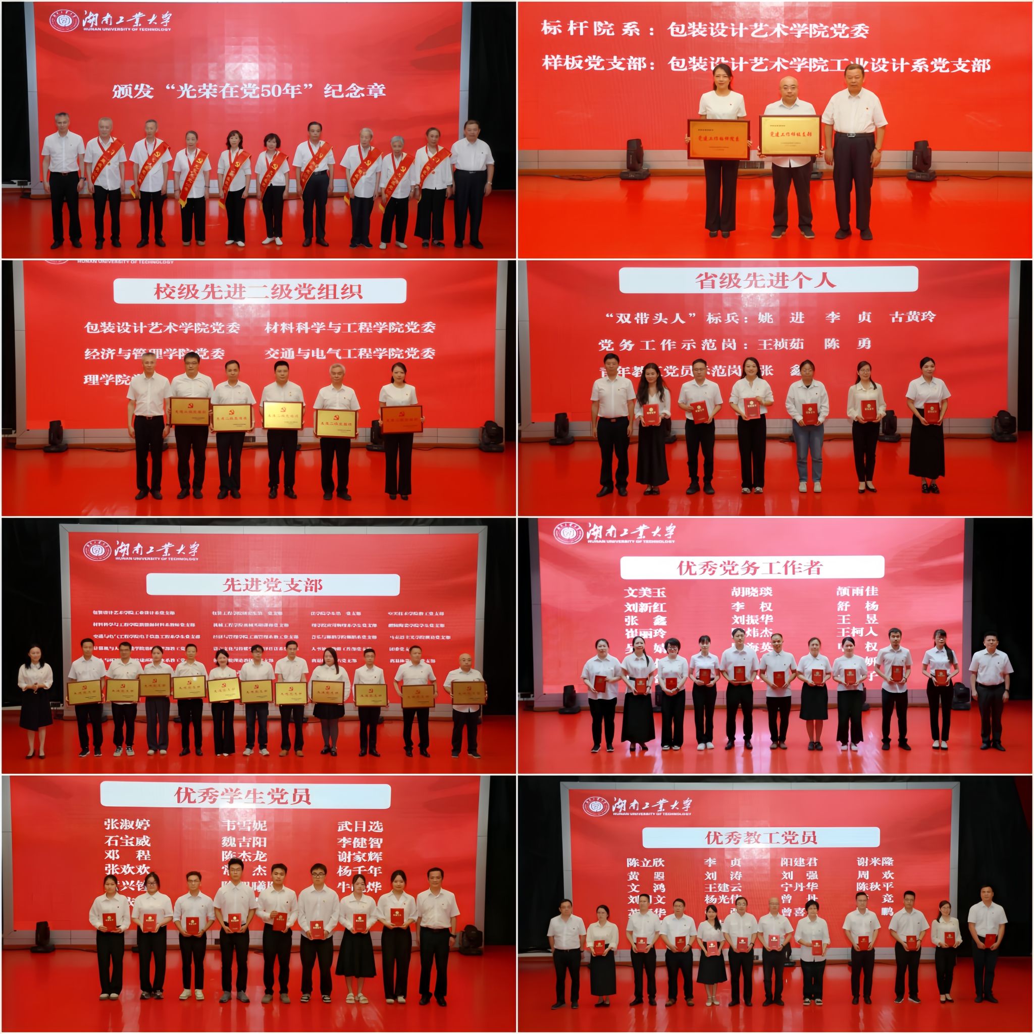 大会在庄严的国歌声中拉开序幕。校长蒋昌波代表校党委宣读了表彰决定。校领导分别为谢米隆等22名优秀教工党员、韦雪妮等17名优秀学生党员、颉雨佳等21名优秀党务工作者、包装设计艺术学院党委等5个先进二级党组织、机械工程学院机械基础课部党支部等22个先进党支部及全省高校党组织“对标争先”建设计划第四批项目、“光荣在党50年”的老党员代表颁发奖牌、奖状和纪念章。