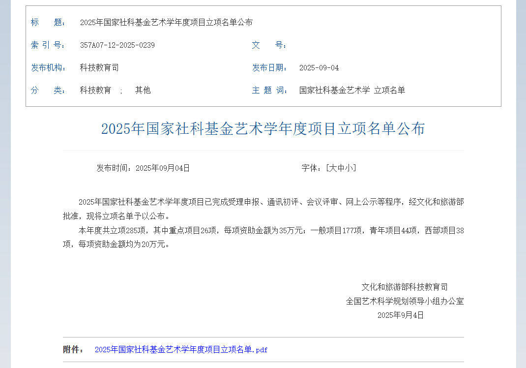 国家社科基金艺术学项目是国家社科基金三大单列学科项目之一,是我国艺术学领域级别最高、权威性最强、影响力最广的科研项目。该类项目旨在推动中国特色艺术学学科体系、学术体系、话语体系建设,着力推进文化自信自强、促进新时代文化艺术高质量发展,为党和国家工作大局服务。本年度共立项285项,其中重点项目26项,一般项目177项,青年项目44项,西部项目38项。