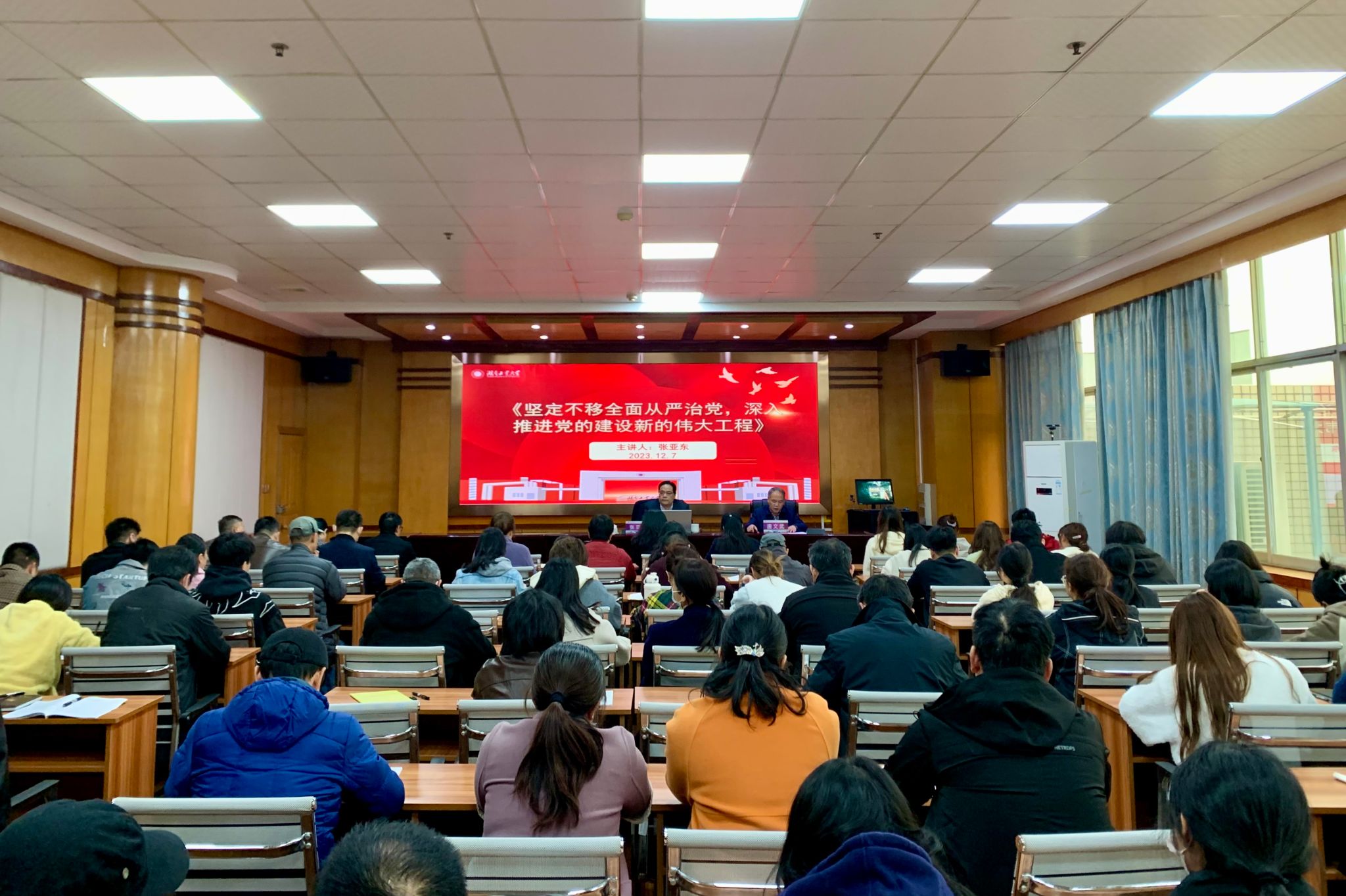 张亚东以《坚定不移全面从严治党,深入推进党的建设新的伟大工程》为题,运用丰富深刻的党史知识,结合具体的廉政警示案例,全面清晰地讲述了深入推进新时代党的建设新的伟大工程的重大意义、丰富内涵和实践要求。他指出,推进新时代党的建设新的伟大工程是贯穿党的百年奋斗历程的重要经验,是有效解决大党独有难题的现实之举,是实现中华民族伟大复兴的必然要求。他要求科技学院进一步加大党支部建设力度,夯实基层党建基础;进一步强化在校学生廉洁文化教育,将廉洁文化全面深入人心。同时,他还对学院党委如何运用党的创新理论、规章制度强化党建工作提出了具体要求。