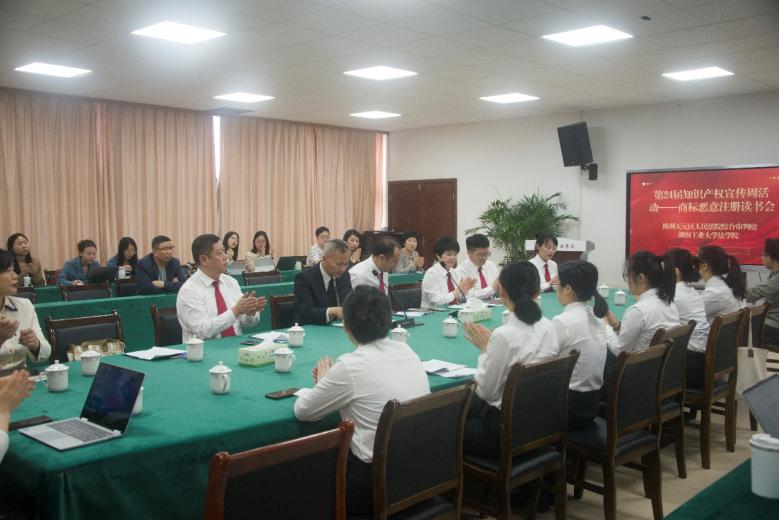 值此第24个世界知识产权日之际,我校法学院与天元区人民法院携手开展了一场主题为“商标恶意抢注制度的理论与实践”的读书会活动。株洲市中级人民法院彭华,天元区人民法院胡劲松,天元区市场监督管理局,株洲市律师协会知识产权委员会及法学院相关负责人和师生代表参加活动。