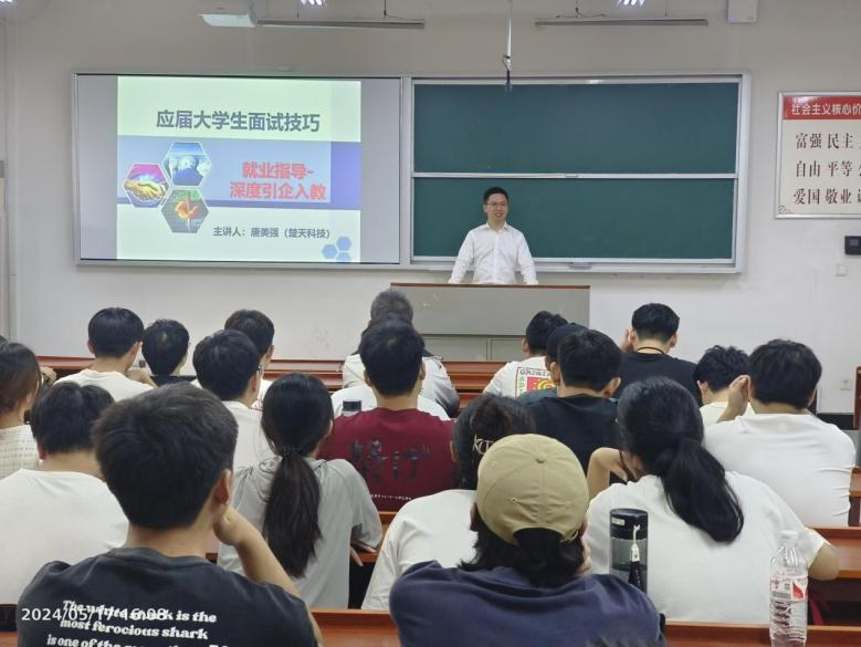 近日,我校电气与信息工程学院《就业指导课》培训课,邀请楚天科技股份有限公司人力资源部高级经理、湖南省人社厅特聘招聘专家唐美强,作题为《应届大学生面试技巧》的讲座。学院师生代表等150余人参加。