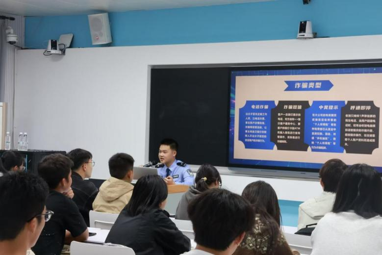 在活动中,两位警官向师生们介绍了当前电信网络诈骗的严峻形势,提供了我校发生的各类诈骗案件的统计数据。结合我校发生的实际案例,详细解读网络贷款诈骗、刷单返利诈骗、冒充电商物流客服诈骗等几种针对大学生群体的常见诈骗手段。这些深入的讲解让学生们深刻认识到诈骗活动的普遍性和潜在的风险,从而提高了他们的警觉性。