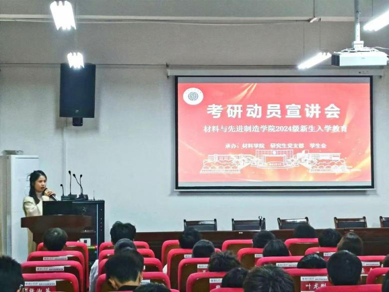 近日,材料与先进制造学院研究生党支部和院学生会共同举办面向2024级新生入学教育——“考研宣讲会”。六位本院的博士研究生和硕士研究生,带着丰富的考研经验和独到的学习见解,走进新生晚自习教室,与他们进行了一次亲密的交流和分享。