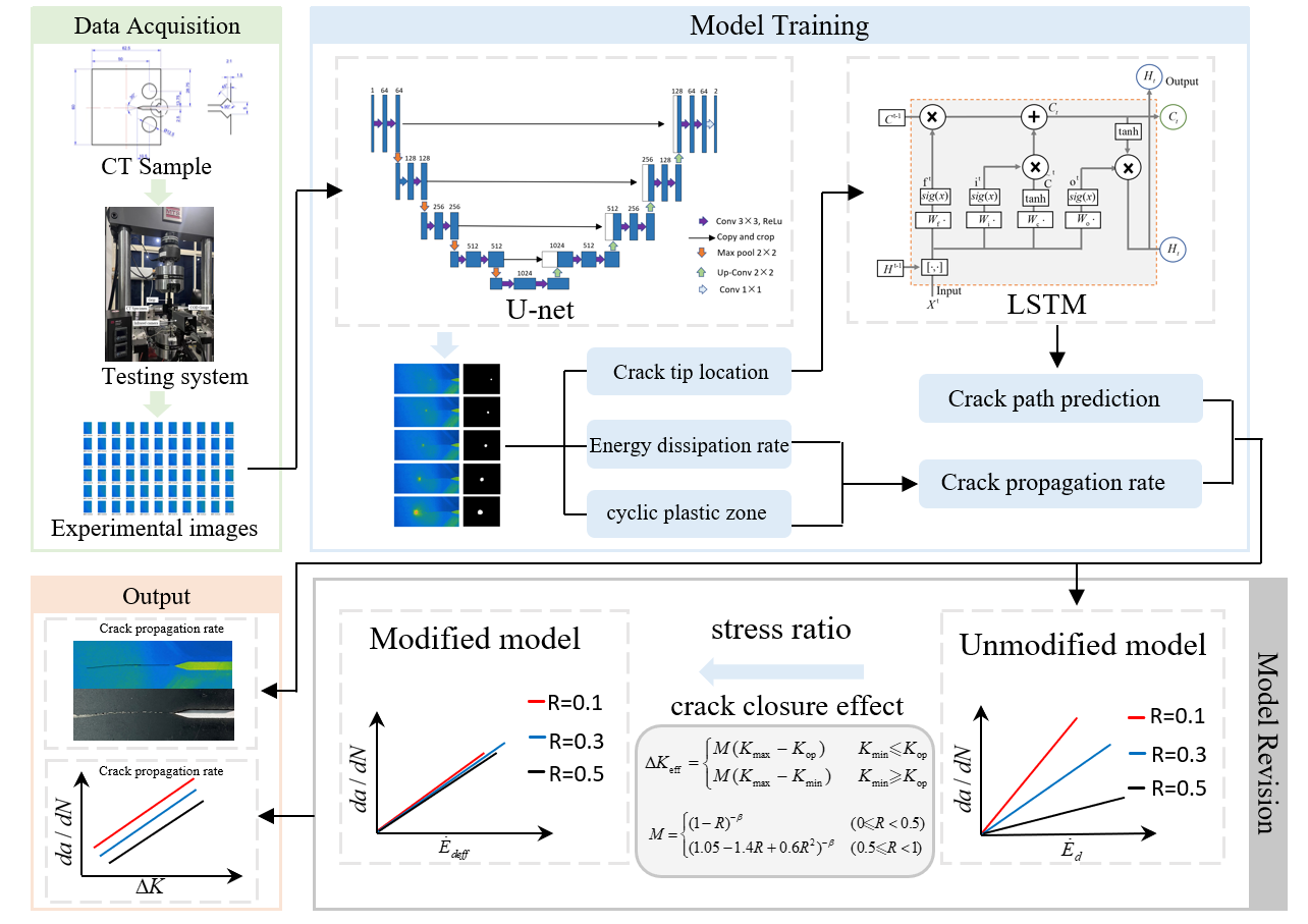 该研究利用红外热成像采集循环载荷作用下CT试样表面疲劳裂纹尖端的温度场演化数据,并利用U-Net模型对裂纹尖端塑性区进行精确分割。基于双层LSTM神经网络框架,实现了TC4钛合金疲劳裂纹扩展路径的动态评估,预测结果与实际裂纹扩展路径接近,确定了疲劳裂纹扩展速率与能量耗散率之间的线性关系。塑性区的总能量耗散率随应力强度范围呈指数增长,验证了循环塑性区热力学响应与裂纹扩展行为的关联关系。实验结果表明,裂纹的扩展速率与应力比有关。为了提高该方法的泛化能力,提出了考虑应力比时的有效能量耗散率,并通过裂纹闭合效应进行了分析,建立一个与应力比无关的裂纹扩展速率与能量耗散率的统一模型,利用该模型预测的TC4钛合金裂纹扩展速率与应力比无关,与传统COD试验结果吻合较好。